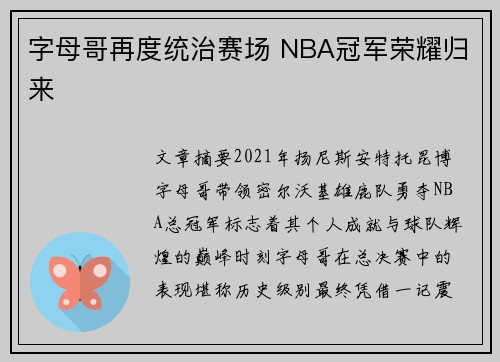 字母哥再度统治赛场 NBA冠军荣耀归来